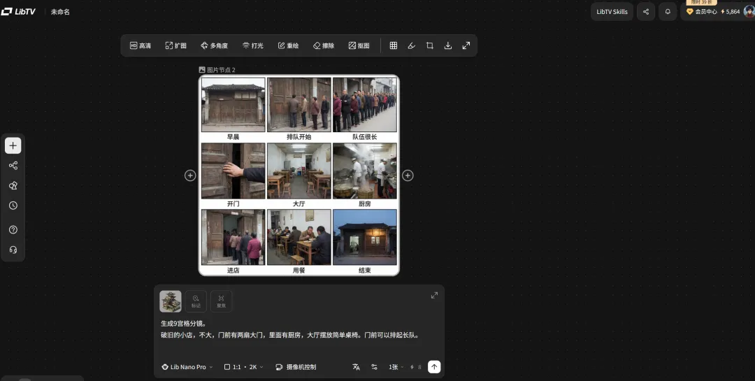 LibTV 引入了 9/25 宫格分镜生成。你只需要输入一句场景描述,它瞬间生成几十种机位供你挑选:远景交代环境、特写捕捉情绪、俯拍展示格局,一目了然。