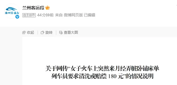 3月20日,兰州铁路局兰州客运段发布关于网传“女子火车上突然来月经弄脏卧铺床单,列车员要求清洗或赔偿180元”的情况说明。
