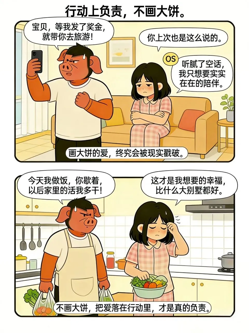 “等我有钱了带你旅游”“以后给你买大房子”,这种话听多了谁会相信呀?真心对你好的人,不是画大饼。是看到你累了还能主动做饭,是看你烦了默默的把家务干了。实际行动比一百句甜言蜜语都实在。