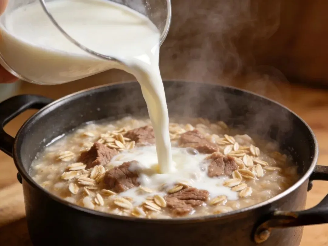 当燕麦煮到糊状时,倒入牛奶,继续搅拌。这一步的关键是不停搅拌,防止糊底。