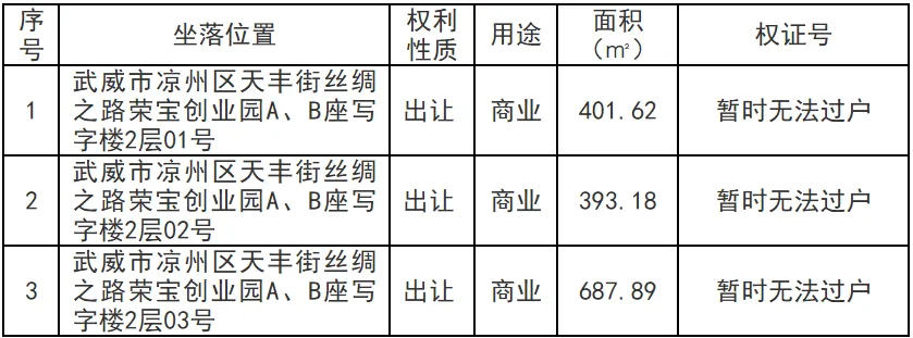 该资产坐落于甘肃省武威市凉州区天丰街丝绸之路荣宝创业园A、B座写字楼2层。房屋供电、供水、供暖等管道齐全。房屋通风、采光、日照条件良好,商业圈成熟,属于新城区中心位置,附近有学校、医院、银行、商业服务等公共服务设施及生活服务设施完善。该资产可用于商业、办公、住宅等。