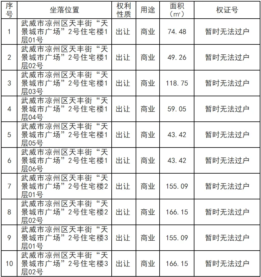 10.武威市凉州区天丰街“天景城市广场”2号住宅楼1层、2层、3层10间商业用房转让项目