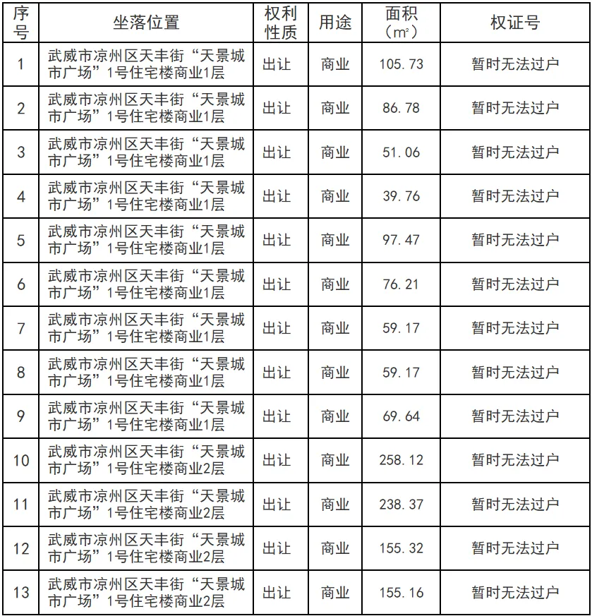 12.武威市凉州区天丰街“天景城市广场”1号住宅楼商业1层、2层13间商业用房转让项目