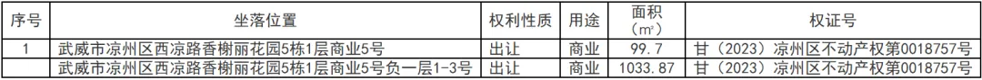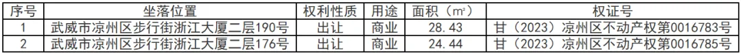 该资产坐落于甘肃省武威市凉州区中心城区。区域内人流密集,商业氛围较好,周边有多路公交线路,公共交通便捷,道路通达度较好,所在区域外部基础设施配套较齐全,道路、供水、排水(雨水、污水)、供电、供暖、通信等设施保障率较高,区域内有学校、银行、电信、邮政等营业网点,公共服务性配套设施完善程度较好。该资产可用于服装批发零售、化妆品店等。上述2间商铺全部可以单独出售。