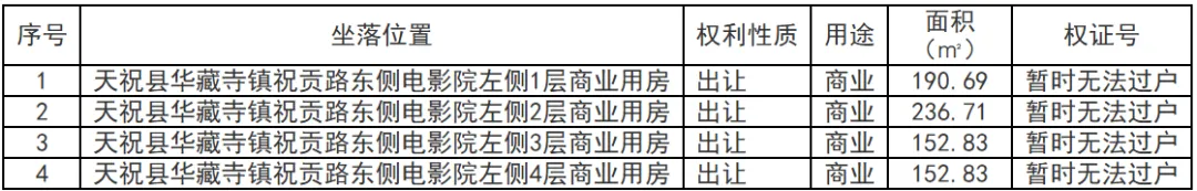 该资产坐落于甘肃省武威市天祝县华藏寺镇祝贡路东侧电影院左侧(14区),为大什字东南角,所在区域外部基础设施达到“七通一平”(通路、通给水、通排水(雨水、污水)、通电、通暖、通讯、通天然气及场地平整),道路通达度较高,道路便捷度较好,区域内商业密集,附近有工行、农行、宾馆等,是发展个体经营的良好地段。上述四层商业可以单独出售转让。