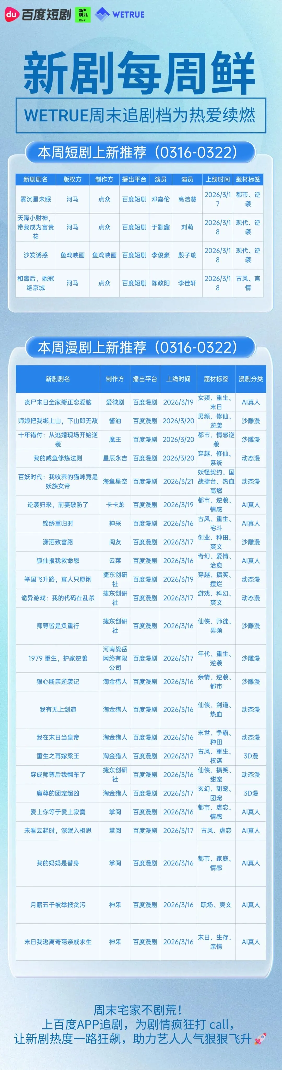 WETRUE新剧每周鲜:周末上百度APP追剧系列(0316-0322)周,漫剧上新清单