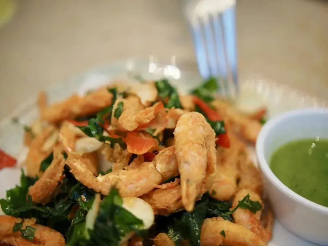 店家用的新鲜河虾,搭配的酸辣酱很有泰式风情,河虾裹了薄薄一层面衣,炸得金黄酥脆,鲜甜无比。