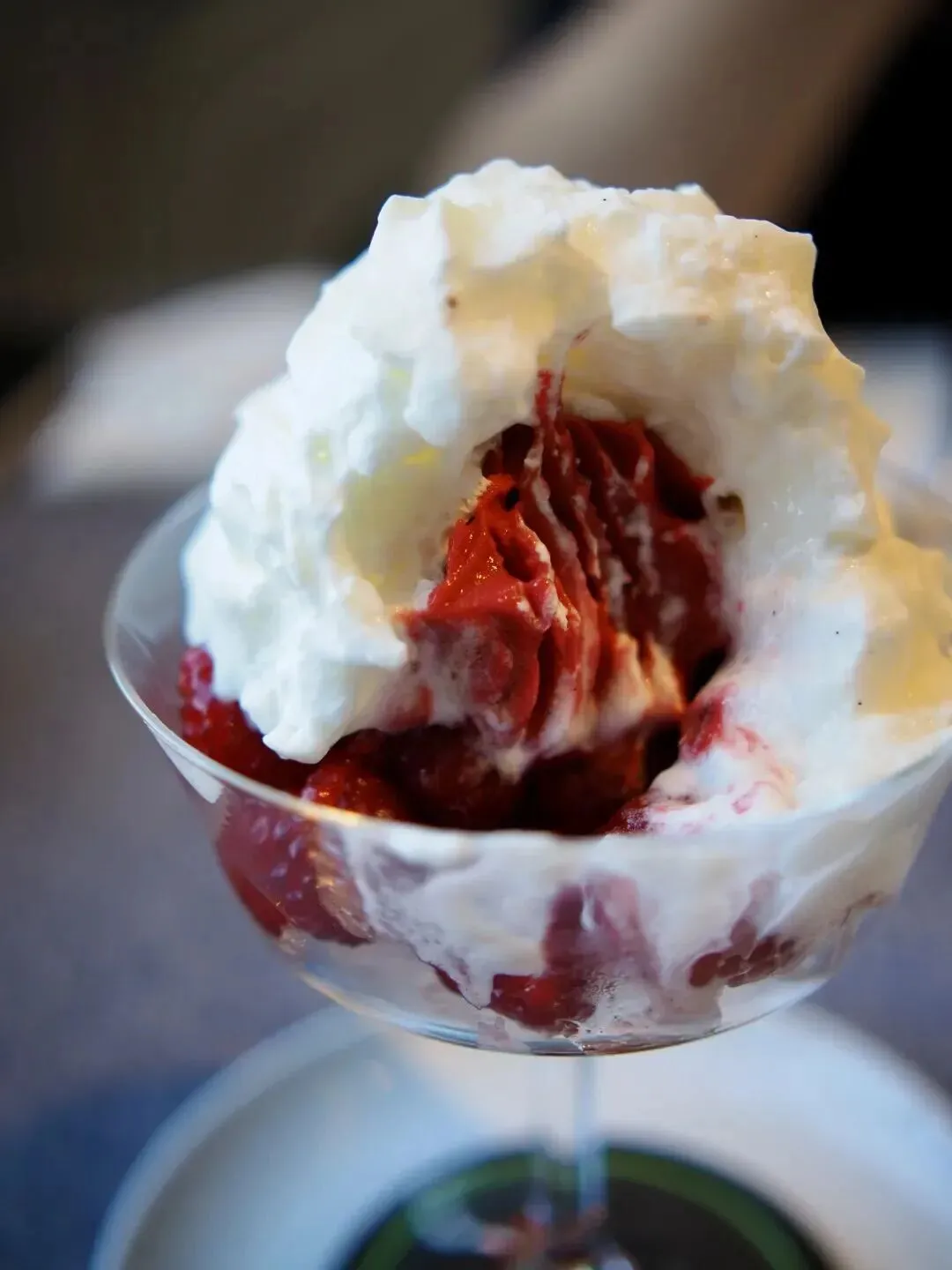 最顶层的轻盈奶油包裹着树莓冰沙,最下面则是新鲜树莓。