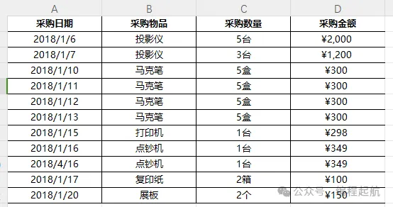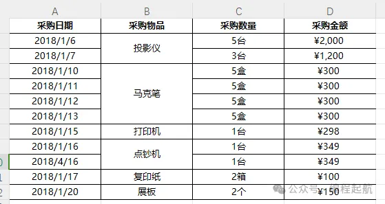 遍历数据行,识别相同的“采购物品”: