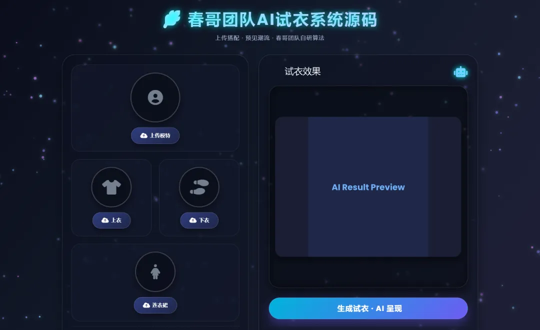 春哥团队AI试衣系统是一款基于深度学习技术的智能图像生成系统,它通过先进的AI算法,能够将任何服装自然地“穿戴”到模特身上,生成高度逼真的试衣效果图。无需实际拍摄,无需专业摄影棚,更无需雇佣模特,只需简单的图片上传,就能在几秒钟内获得高清的试衣图片。