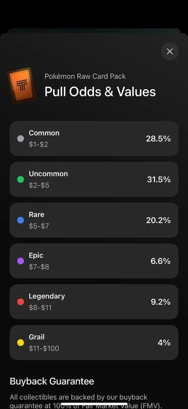 Rips by Triumph 中的卡包分 Normal、High、MAX ODDS 三档,卡包的单价越贵,开出“Grail” 高价稀有卡)的概率越高,根据 Reddit 用户给出的截图,App 会在用户购买卡包时,提示相应的开卡几率。