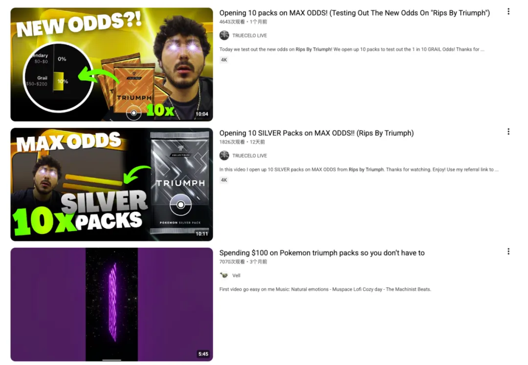 观察网上的拆卡视频发现,Rips by Triumph 能够开出经过 PSA(卡牌的认证机构)评级的卡牌,但尚不知道经过评级的卡牌是平台方直接在二级市场上收购的、还是购买卡包、拆卡之后再送去评级的。
