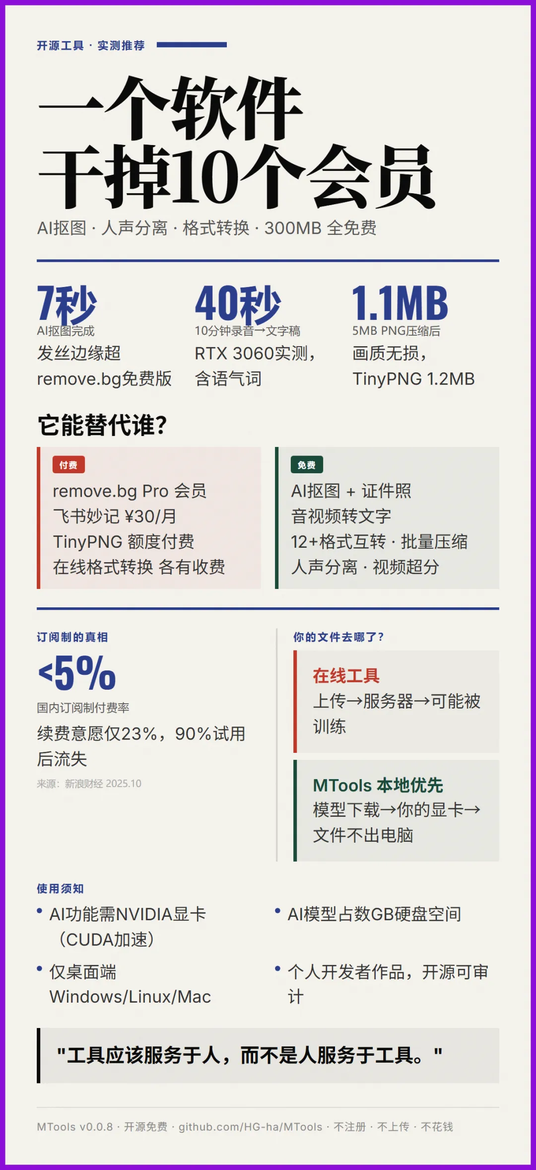 但如果你跟我一样,做内容创作经常要处理图片、转格式、把录音变成文字,MTools解决的是另一个问题——