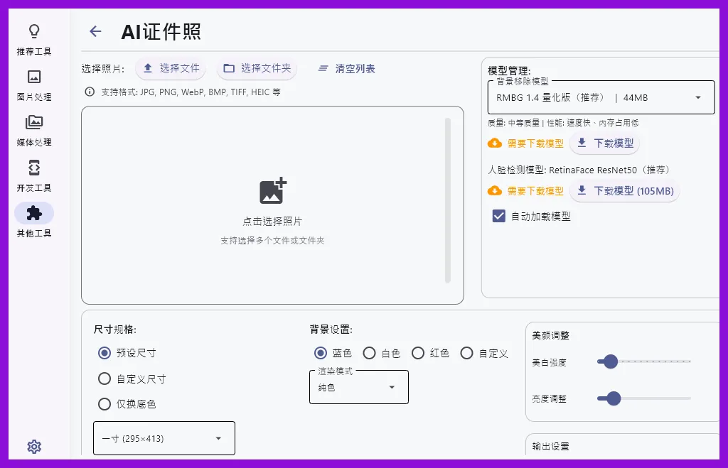 界面很简单,左边是功能分类——AI工具、图片工具、音视频工具、开发工具,右边是操作区域。干净利落,没有广告,没有弹窗。