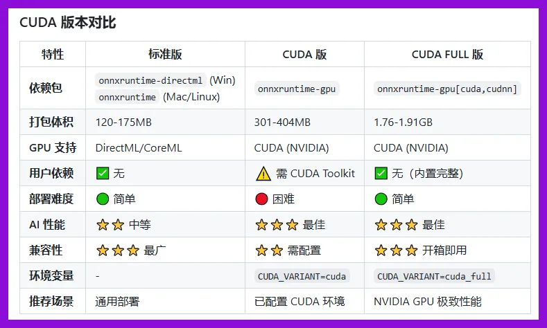 日常格式转换、压缩、裁剪 → 普通版(127MB) AI抠图、语音转文字 → CUDA版(需N卡,GTX 1060及以上) 专业视频处理、批量AI任务 → CUDA_FULL版(需RTX 3070及以上)
