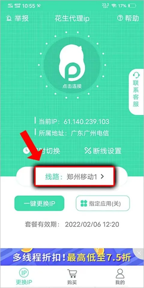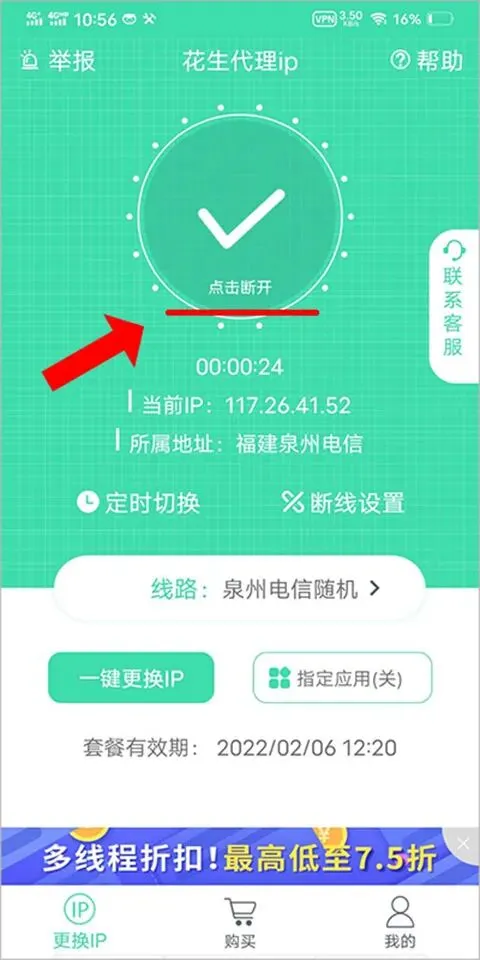 3、或者在首页,点击APP中央的【点击连接】或【一键更换IP】也可更换ip