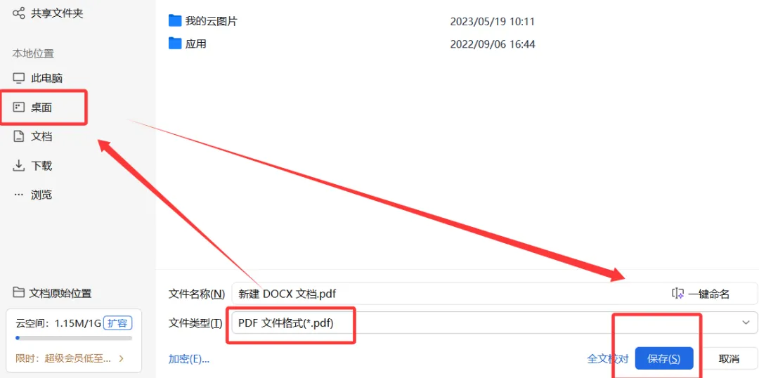 3.在选择“桌面”,最后点击保存,新的PDF格式就会出现在桌面上了