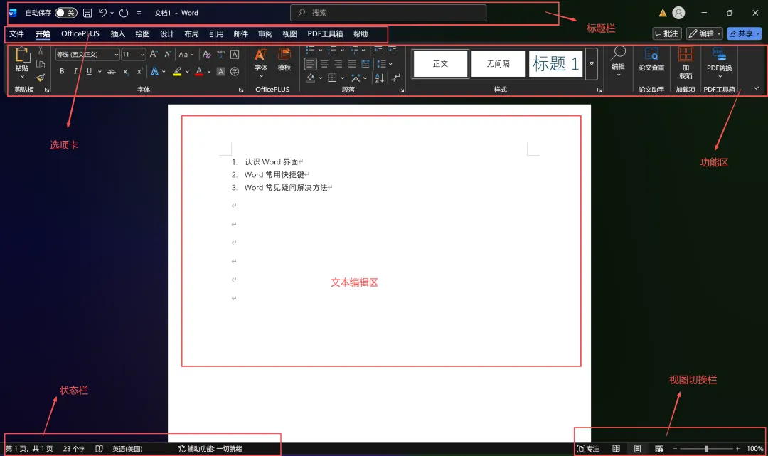 状态栏:包含页面、字数、校对、输入法等。