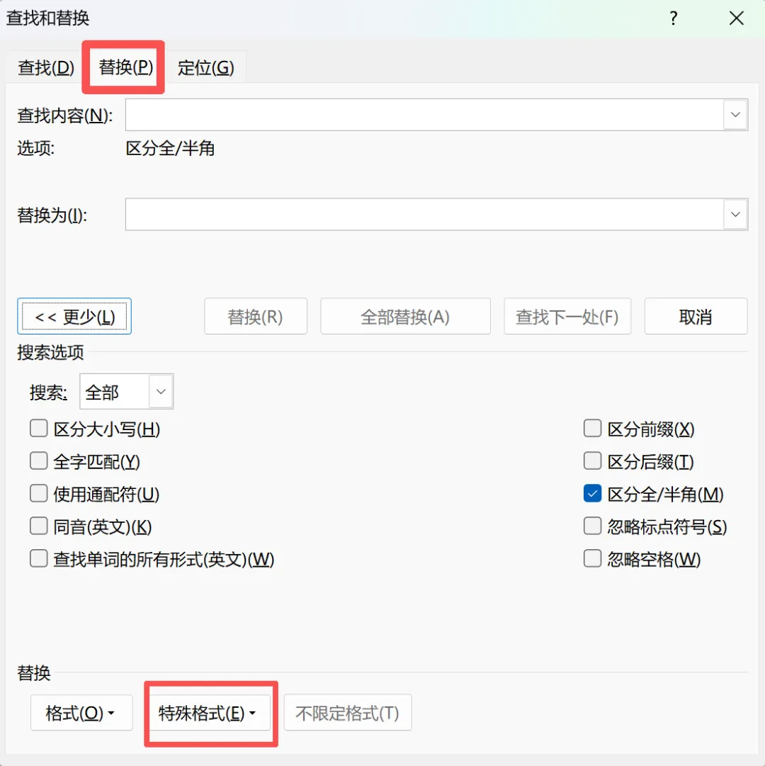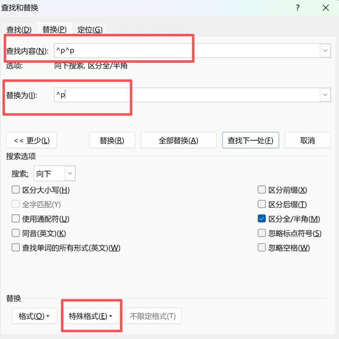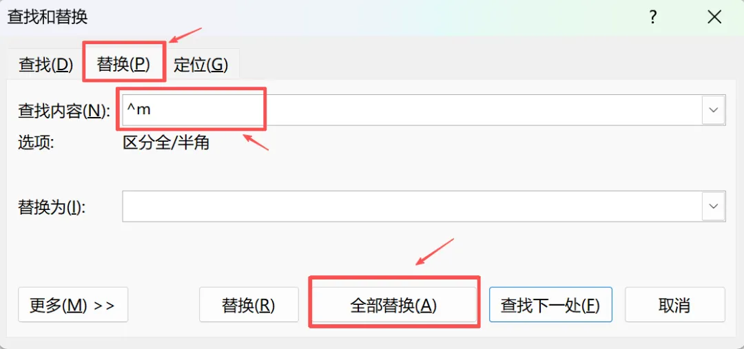④如果是多页面都有空白页,Ctrl+H → 替换→查找处输入 ^m → 替换为空 → 全部替换。