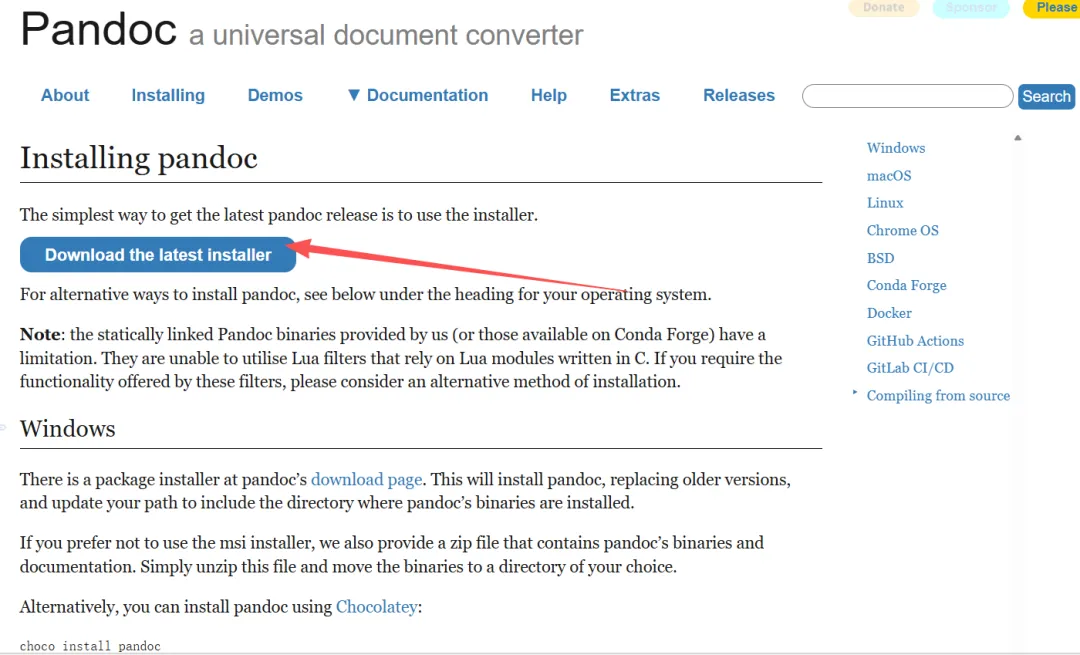 1、访问 Pandoc 官网(https://pandoc.org/installing.html)