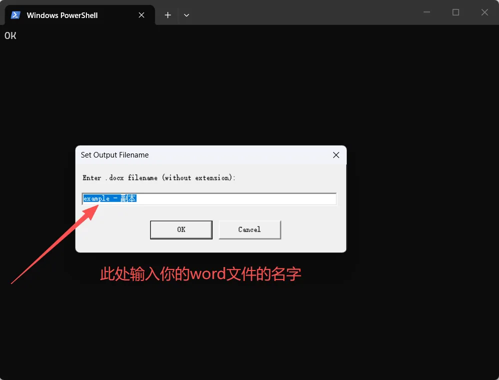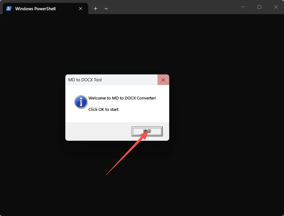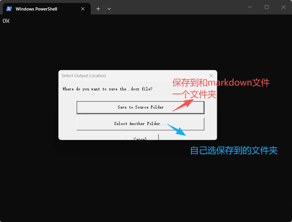 [Console]::OutputEncoding = [System.Text.Encoding]::UTF8$OutputEncoding = [System.Text.Encoding]::UTF8Add-Type -AssemblyName System.Windows.FormsAdd-Type -AssemblyName System.DrawingfunctionShow-Message {param([string]$Message,[string]$Title = "Tip",[string]$Type = "Info")switch ($Type) {"Error" { [System.Windows.Forms.MessageBox]::Show($Message, $Title, "OK", "Error") }"Warning" { [System.Windows.Forms.MessageBox]::Show($Message, $Title, "OK", "Warning") }default { [System.Windows.Forms.MessageBox]::Show($Message, $Title, "OK", "Information") }}}functionSelect-Folder {param([string]$Description = "Select folder")$folderBrowser = New-Object System.Windows.Forms.FolderBrowserDialog$folderBrowser.Description = $Description$folderBrowser.ShowNewFolderButton = $trueif ($folderBrowser.ShowDialog() -eq "OK") {return $folderBrowser.SelectedPath}return $null}functionSelect-MdFile {param([string]$FolderPath)$mdFiles = Get-ChildItem -Path $FolderPath -Filter "*.md" -Fileif ($mdFiles.Count -eq 0) {Show-Message "No .md files found in selected folder!" "Warning" "Warning"return $null}$form = New-Object System.Windows.Forms.Form$form.Text = "Select Markdown File"$form.Size = New-Object System.Drawing.Size(500, 400)$form.StartPosition = "CenterScreen"$form.FormBorderStyle = "FixedDialog"$form.MaximizeBox = $false$form.MinimizeBox = $false$label = New-Object System.Windows.Forms.Label$label.Text = "Select a .md file to convert:"$label.Location = New-Object System.Drawing.Point(10, 10)$label.Size = New-Object System.Drawing.Size(460, 25)$form.Controls.Add($label)$listBox = New-Object System.Windows.Forms.ListBox$listBox.Location = New-Object System.Drawing.Point(10, 40)$listBox.Size = New-Object System.Drawing.Size(460, 250)$listBox.SelectionMode = "One"foreach ($file in $mdFiles) {$listBox.Items.Add($file.Name) | Out-Null}$listBox.SelectedIndex = 0$form.Controls.Add($listBox)$btnConfirm = New-Object System.Windows.Forms.Button$btnConfirm.Text = "OK"$btnConfirm.Location = New-Object System.Drawing.Point(150, 310)$btnConfirm.Size = New-Object System.Drawing.Size(100, 30)$btnConfirm.DialogResult = "OK"$form.Controls.Add($btnConfirm)$btnCancel = New-Object System.Windows.Forms.Button$btnCancel.Text = "Cancel"$btnCancel.Location = New-Object System.Drawing.Point(260, 310)$btnCancel.Size = New-Object System.Drawing.Size(100, 30)$btnCancel.DialogResult = "Cancel"$form.Controls.Add($btnCancel)$form.AcceptButton = $btnConfirm$form.CancelButton = $btnCancel$result = $form.ShowDialog()if ($result -eq "OK" -and $listBox.SelectedItem) {$selectedFileName = $listBox.SelectedItem.ToString()return Join-Path $FolderPath $selectedFileName}return $null}functionGet-DocxFileName {param([string]$OriginalName)$defaultName = [System.IO.Path]::GetFileNameWithoutExtension($OriginalName)$form = New-Object System.Windows.Forms.Form$form.Text = "Set Output Filename"$form.Size = New-Object System.Drawing.Size(450, 180)$form.StartPosition = "CenterScreen"$form.FormBorderStyle = "FixedDialog"$form.MaximizeBox = $false$form.MinimizeBox = $false$label = New-Object System.Windows.Forms.Label$label.Text = "Enter .docx filename (without extension):"$label.Location = New-Object System.Drawing.Point(10, 15)$label.Size = New-Object System.Drawing.Size(410, 25)$form.Controls.Add($label)$textBox = New-Object System.Windows.Forms.TextBox$textBox.Location = New-Object System.Drawing.Point(10, 45)$textBox.Size = New-Object System.Drawing.Size(410, 25)$textBox.Text = $defaultName$textBox.SelectAll()$form.Controls.Add($textBox)$btnConfirm = New-Object System.Windows.Forms.Button$btnConfirm.Text = "OK"$btnConfirm.Location = New-Object System.Drawing.Point(120, 90)$btnConfirm.Size = New-Object System.Drawing.Size(100, 30)$btnConfirm.DialogResult = "OK"$form.Controls.Add($btnConfirm)$btnCancel = New-Object System.Windows.Forms.Button$btnCancel.Text = "Cancel"$btnCancel.Location = New-Object System.Drawing.Point(230, 90)$btnCancel.Size = New-Object System.Drawing.Size(100, 30)$btnCancel.DialogResult = "Cancel"$form.Controls.Add($btnCancel)$form.AcceptButton = $btnConfirm$form.CancelButton = $btnCancel$result = $form.ShowDialog()if ($result -eq "OK") {$fileName = $textBox.Text.Trim()if ([string]::IsNullOrWhiteSpace($fileName)) {return $defaultName}return $fileName}return $null}functionSelect-OutputLocation {param([string]$SourceFolder)$form = New-Object System.Windows.Forms.Form$form.Text = "Select Output Location"$form.Size = New-Object System.Drawing.Size(450, 200)$form.StartPosition = "CenterScreen"$form.FormBorderStyle = "FixedDialog"$form.MaximizeBox = $false$form.MinimizeBox = $false$label = New-Object System.Windows.Forms.Label$label.Text = "Where do you want to save the .docx file?"$label.Location = New-Object System.Drawing.Point(10, 15)$label.Size = New-Object System.Drawing.Size(410, 25)$form.Controls.Add($label)$btnSourceFolder = New-Object System.Windows.Forms.Button$btnSourceFolder.Text = "Save to Source Folder"$btnSourceFolder.Location = New-Object System.Drawing.Point(50, 55)$btnSourceFolder.Size = New-Object System.Drawing.Size(350, 35)$btnSourceFolder.Tag = "Source"$btnSourceFolder.DialogResult = "OK"$form.Controls.Add($btnSourceFolder)$btnOtherFolder = New-Object System.Windows.Forms.Button$btnOtherFolder.Text = "Select Another Folder..."$btnOtherFolder.Location = New-Object System.Drawing.Point(50, 100)$btnOtherFolder.Size = New-Object System.Drawing.Size(350, 35)$btnOtherFolder.Tag = "Other"$btnOtherFolder.DialogResult = "OK"$form.Controls.Add($btnOtherFolder)$btnCancel = New-Object System.Windows.Forms.Button$btnCancel.Text = "Cancel"$btnCancel.Location = New-Object System.Drawing.Point(175, 145)$btnCancel.Size = New-Object System.Drawing.Size(100, 30)$btnCancel.DialogResult = "Cancel"$form.Controls.Add($btnCancel)$script:selectedOption = $null$btnSourceFolder.Add_Click({$script:selectedOption = "Source"$form.Tag = "Source"})$btnOtherFolder.Add_Click({$script:selectedOption = "Other"$form.Tag = "Other"})$result = $form.ShowDialog()if