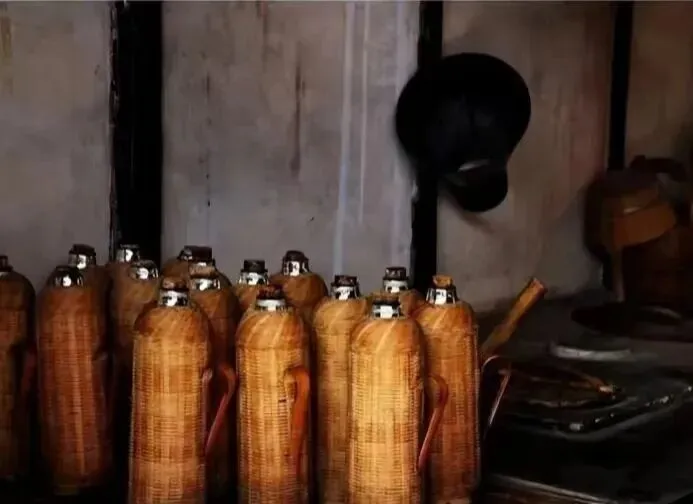 这一排竹编暖壶就剩在老厨房里了,外面一层竹皮细细密密编成,金黄温润,里头才是玻璃胆,瓶口却老是掉漆,小时候我跟姐姐抢水喝,妈妈总在旁边喊小心烫着,灌满热水盖子一扣,一上午都还是烫手的,家里白天吃饭喝水全靠这一壶撑场面,有的时候冬天夜里嘴馋,悄悄下炕倒点余温的水喝一口,感觉能顶半夜,不像现在保温杯随身一带,暖壶多半成了杂物间的摆设,可那竹壳把手一拎起来,全是过去生活的影子。
