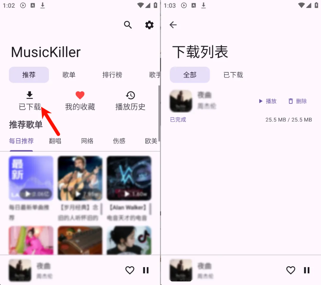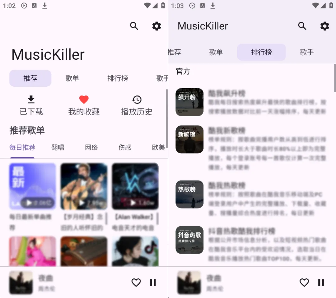 软件内有推荐哥欠单和音悦排行榜,不知道听啥的时候可以看看