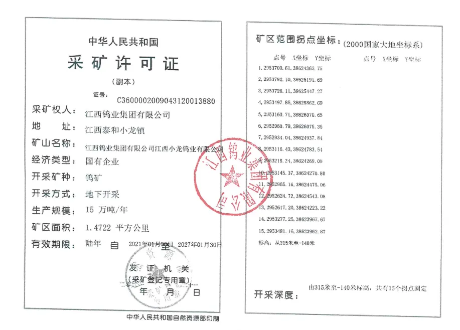 项目概述:本次转让标的系江西钨业集团有限公司江西小龙钨业有限公司采矿权,具体以采矿许可证(证号:C3600002009043120013880,有效期至2027年1月30日)划定范围为准。采矿权人:江西钨业集团有限公司,地址:江西泰和小龙镇;矿山名称:江西钨业集团有限公司江西小龙钨业有限公司,开采矿种:钨矿,开采方式:地下开采。
