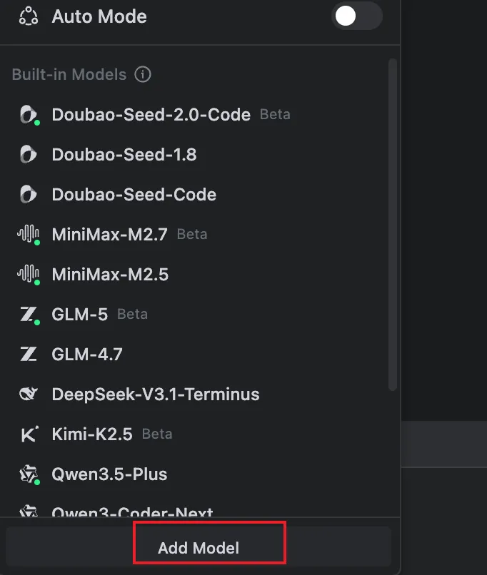 第二步:在 Trae 中点击”Add Model”添加自定义模型: