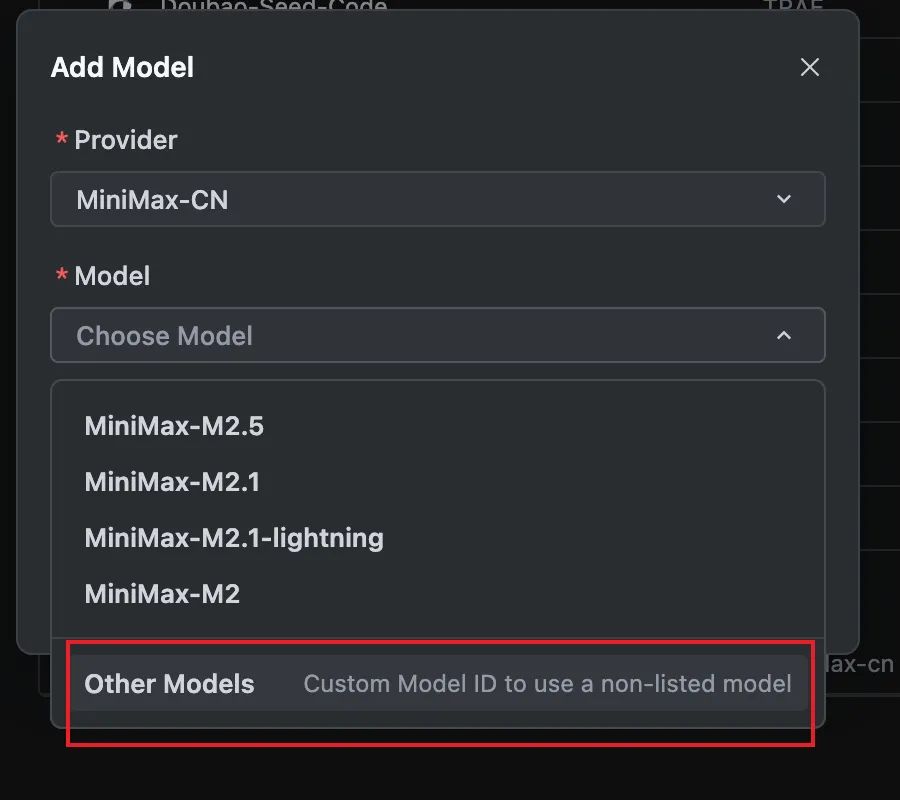 第三步:由于 Trae 暂未内置 M2.7,需要选择”Other Models”并手动输入模型 ID 和 API Key: