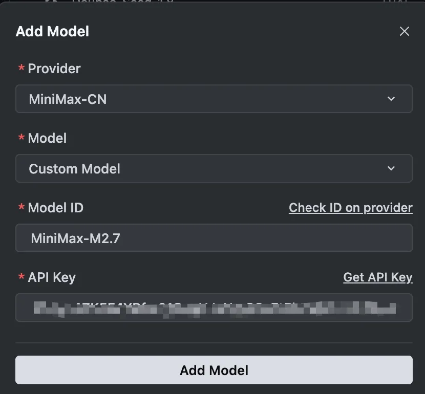 第四步:输入MiniMax-M2.7和申请的 API Key,点击”Add Model”。若无报错提示,即表示接入成功: