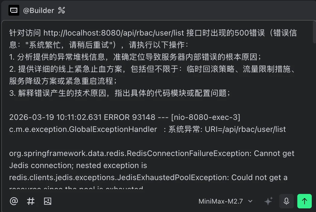 M2.7 针对既定异常栈帧快速梳理了代码调用逻辑,准确地指出:列表查询接口被切面拦截,连接池耗尽是 500 错误的根因。更关键的是,它指出了这段代码缺乏降级策略——这一点笔者是在复盘会上才意识到的。