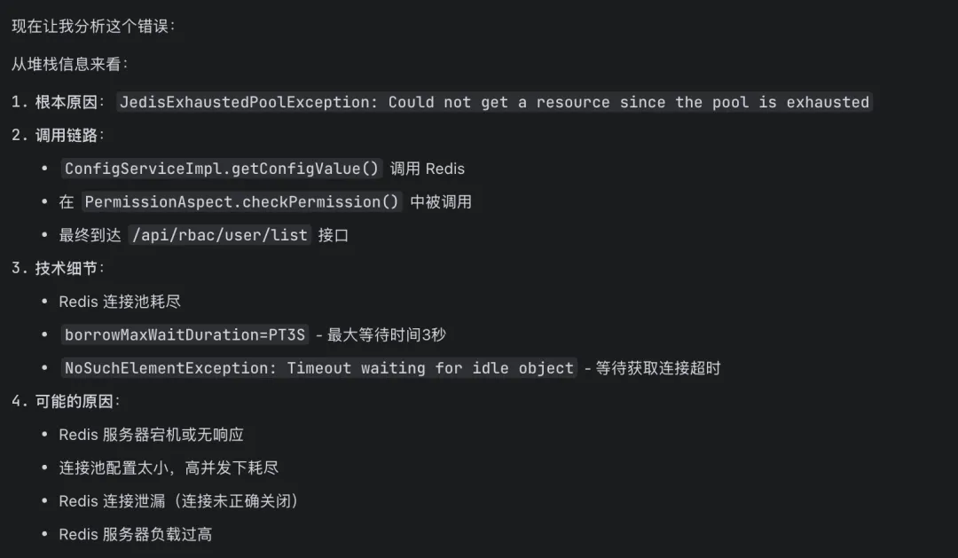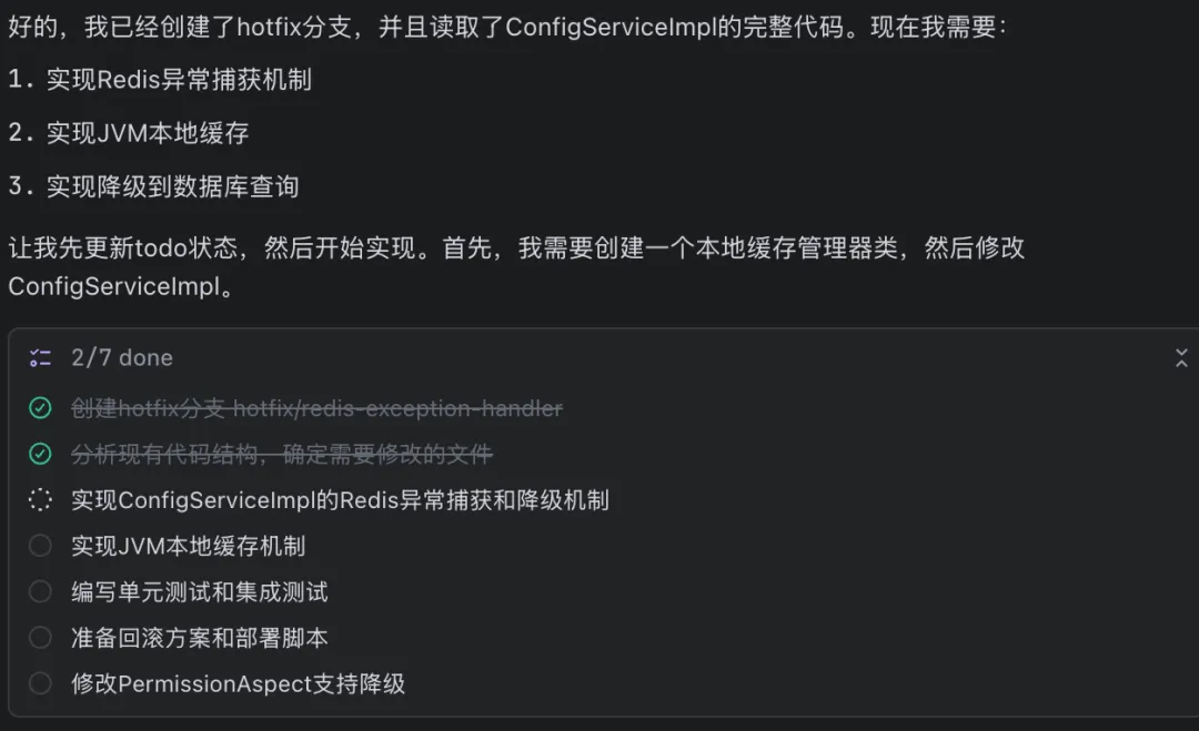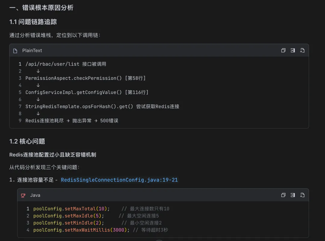 不过也发现了一些小问题:它给出的方案一(清除 Redis 缓存)略显激进,实际生产环境可能需要更保守的策略。另外,部分边界条件的防御性代码还是需要人工补充——AI 能帮你走到 90%,剩下的 10%还得靠自己。