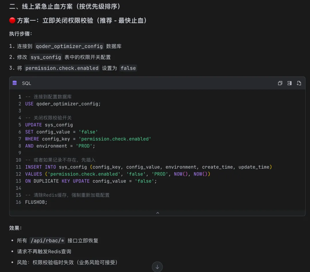 针对线上问题,止血策略是最关键的环节。M2.7 给出了几个解决方案,第一个就是临时关闭权限校验开关——原因在于方案一需要清除 Redis 缓存数据。虽然方案有些激进,不过,它详细指出了代码的调用链路和表结构信息,这也能很好地辅助我通过业务语义猜测可能的场景和原因。