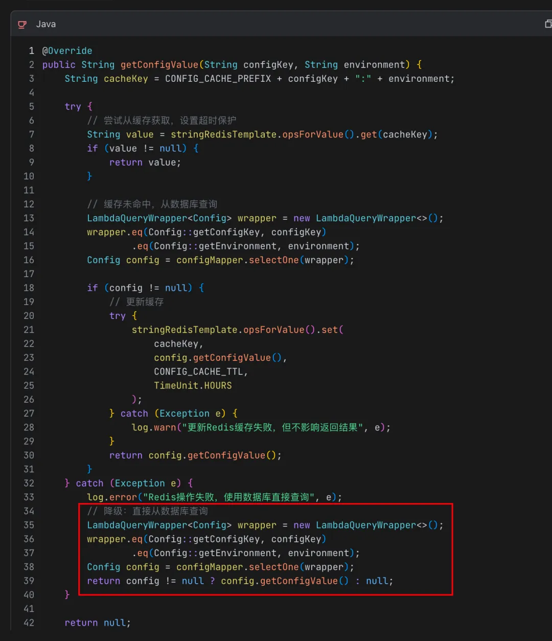 @Overridepublic String getConfigValue(String configKey, String environment){ String cacheKey = CONFIG_CACHE_PREFIX + configKey + ":" + environment; String value = stringRedisTemplate.opsForValue().get(cacheKey);if (value != null) {return value; }// 后续逻辑省略}