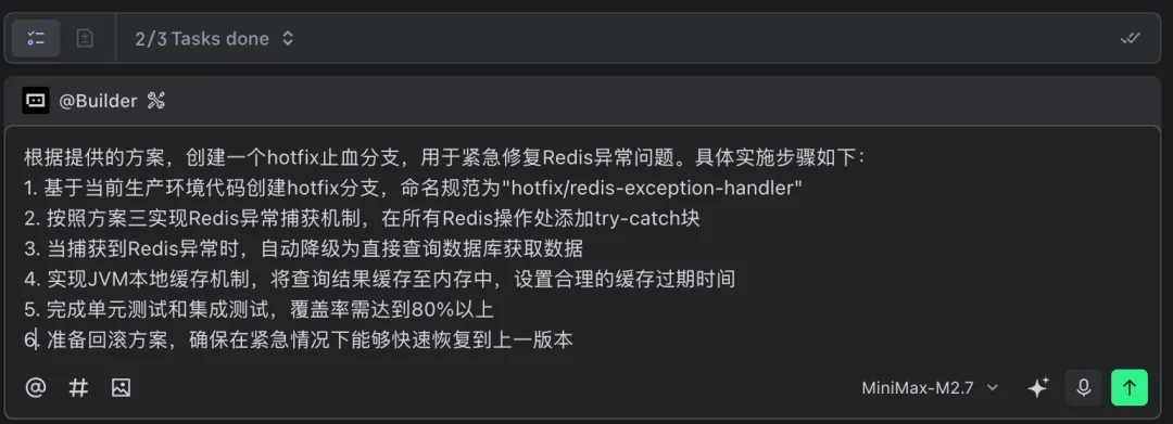 到这一步,M2.7 已经把问题空间从”N 处 Redis 调用”压缩到了”4 种可能根因”——这种快速收敛问题范围的能力,和官方 SWE-Pro 56.22%的成绩基本吻合。接下来看它的止血思路。
