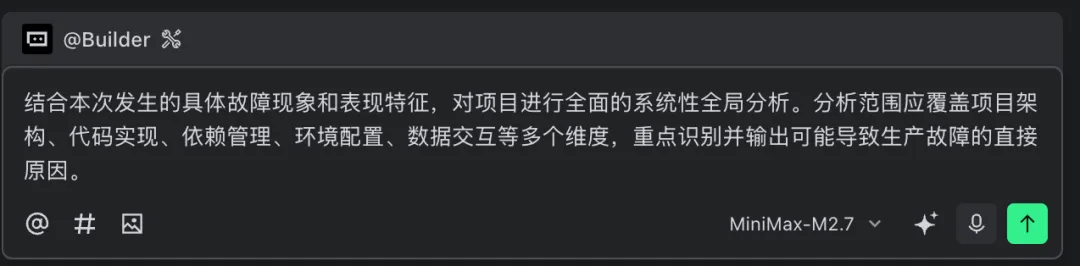 为了验证 M2.7 的实际能力,笔者复刻了该故障场景(已脱敏),并让 M2.7 接手处理。按照企业级线上故障处理流程,首先需要定位根因并完成止血。于是笔者向 M2.7 下达了第一条指令: