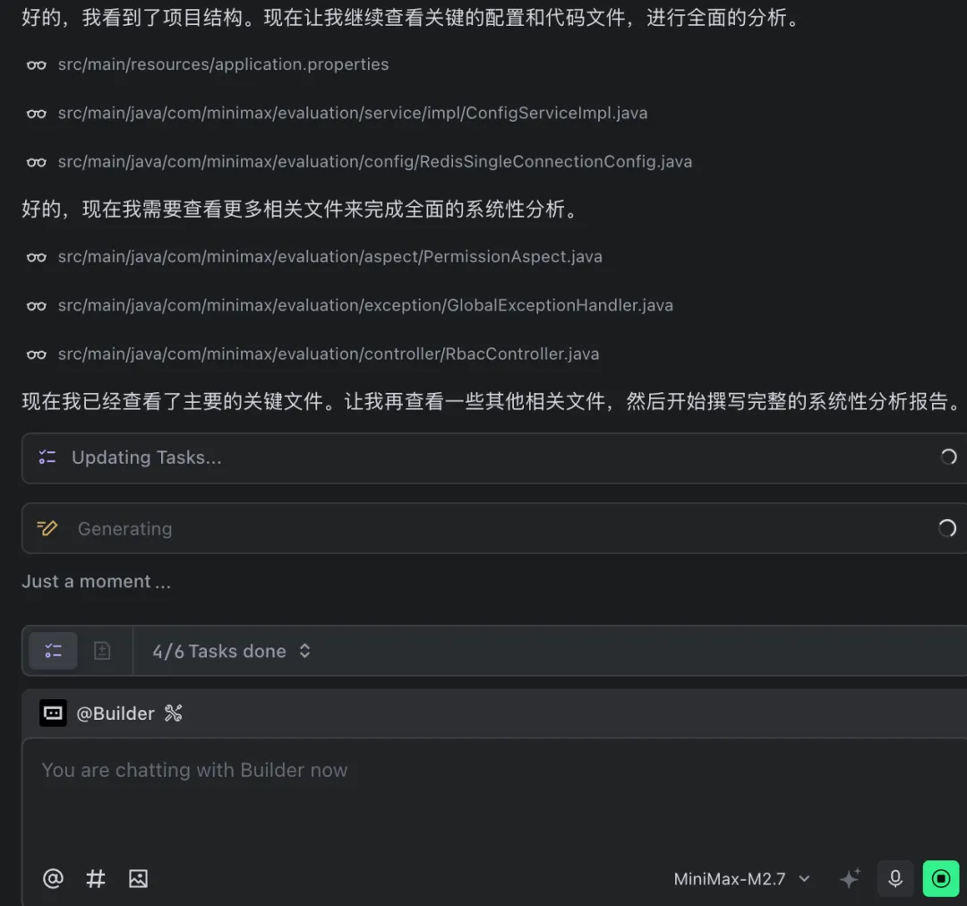 此时 M2.7 开始基于全局项目结构和上下文进行详细的阅读和推理分析: