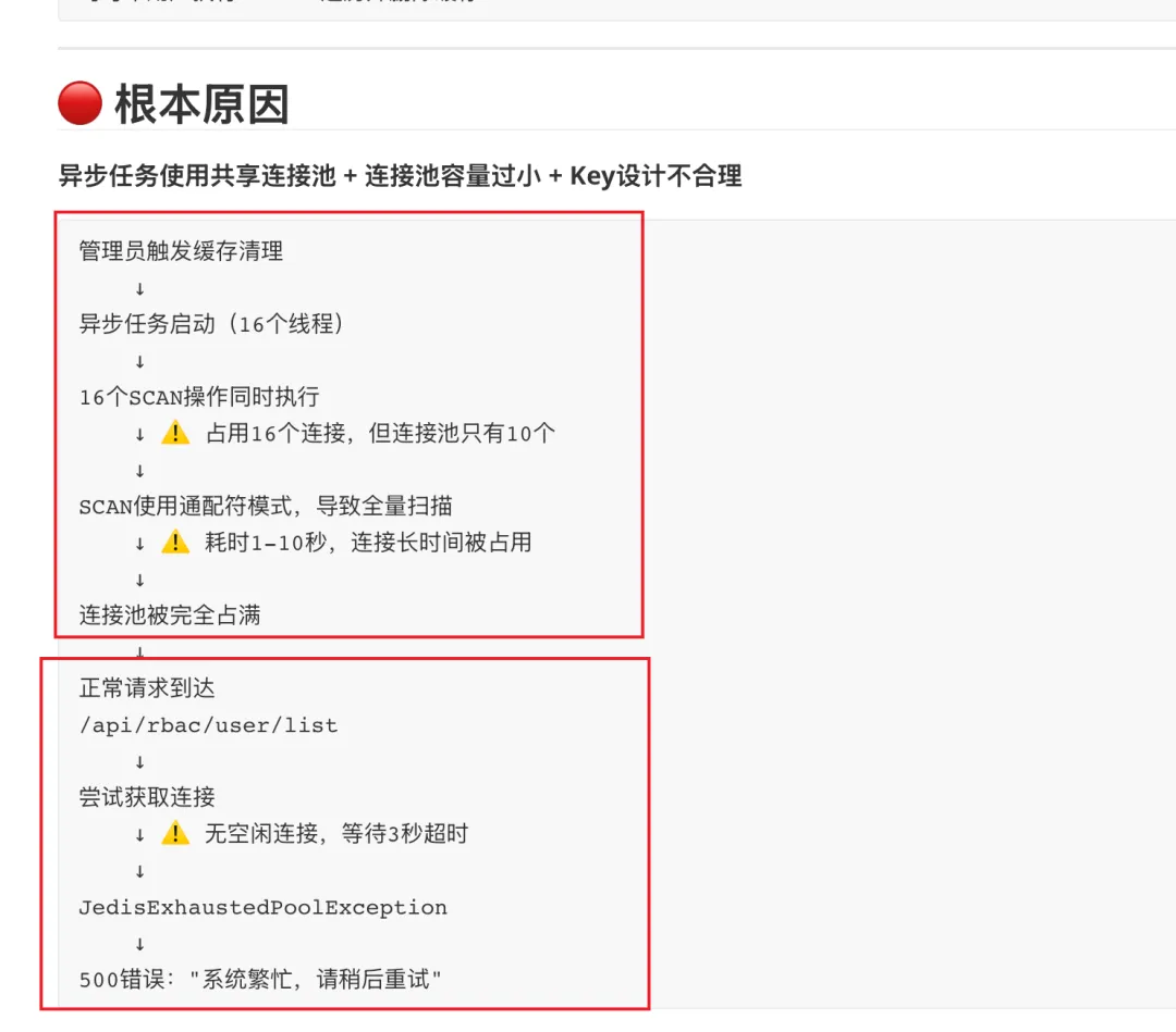 最终 M2.7 给出了非常精准且详细的故障分析报告,指出根因:不当的 Redis 数据结构设计使用 scan 操作导致连接池夯死。同时,文档还结合上下文给出了该操作的业务流程,便于我们迅速理解这条故障链路: