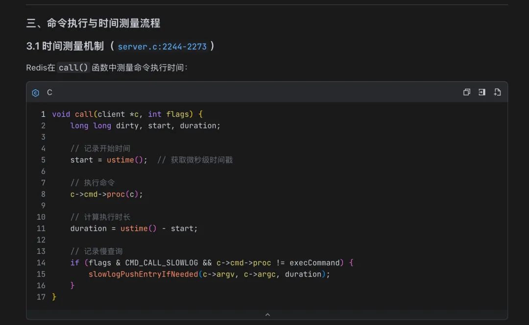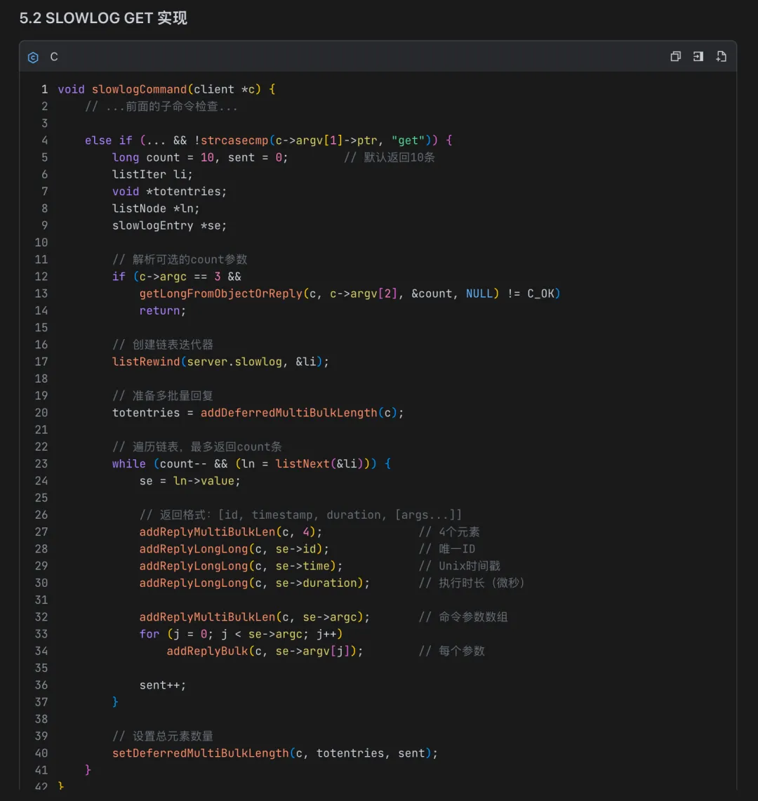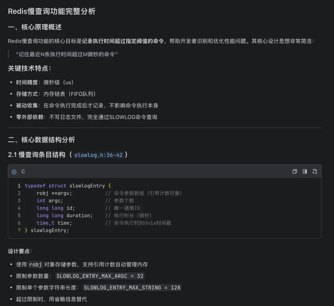 最后就是核心的慢查询指令实现,无论是参数解析还是指令查询和响应处理函数,M2.7 都非常准确地结合笔者的当前项目封装的逻辑给出明确的编码方案: