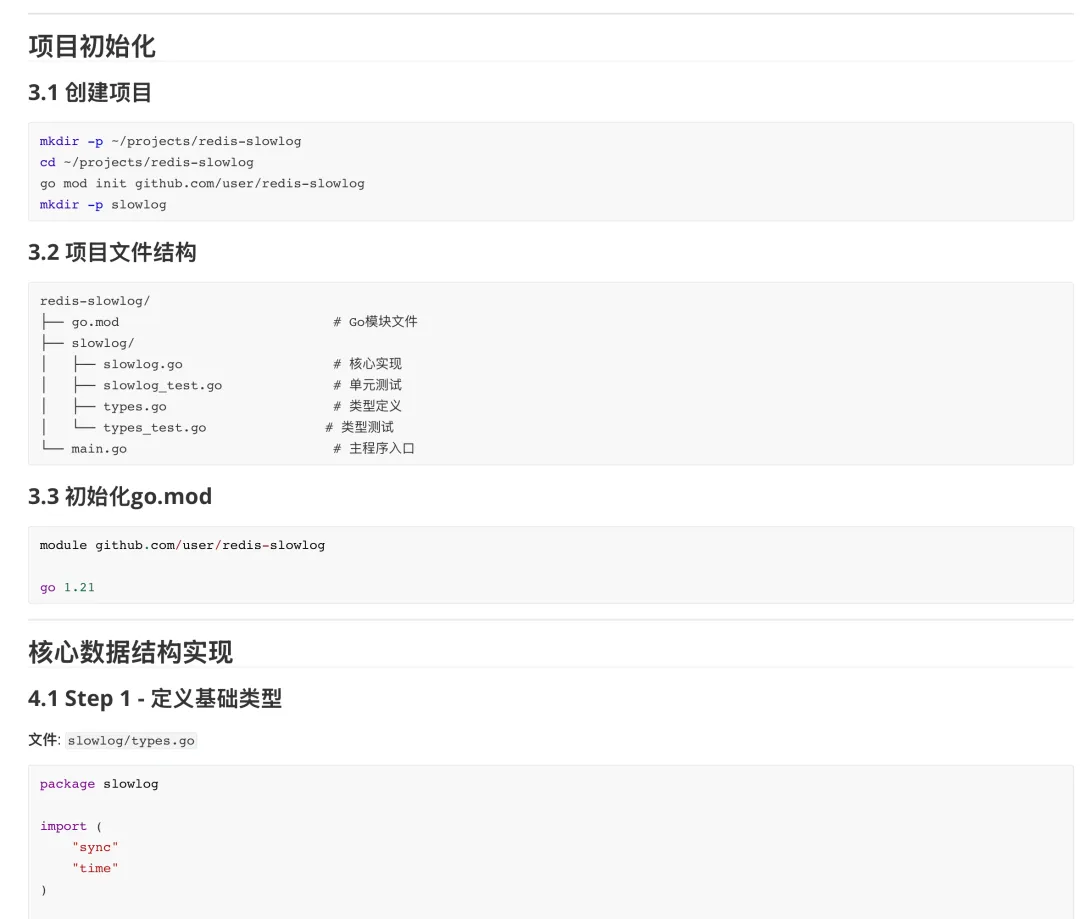 按照测试驱动开发(TDD)方法论,使用Go语言创建一个全面详细的开发教程文档,指导复刻Redis的实现。该教程必须符合以下规范:1. 开发方法: - 严格执行测试驱动开发工作流程:先编写会失败的测试,然后实现最简代码以通过测试,最后进行重构 - 采用类似于原始Redis C语言实现的面向过程的编程风格 - 尽可能使用纯Go语法和标准库2. 教程结构: - 从项目设置和环境配置说明开始 - 按Redis功能拆分为逻辑模块进行开发 - 针对每个模块/特性,提供: a. 明确的测试用例定义,包含预期输入和输出 b. 逐步的代码实现,附带逐行解释 c. 明确的测试命令和验证流程 d. 预期测试结果和成功标准3. 技术要求: - 包含所有组件的完整代码片段 - 指定确切的文件结构和命名规范 - 详细说明编译和测试命令 - 解释常见问题的调试流程 - 在适用时参考相关的Redis C源代码模式4. 实现细节: - 从核心数据结构(字符串、列表、哈希等)开始 - 逐步推进到命令处理和协议实现 - 包含网络层和客户端-服务器通信 - 涵盖持久化机制(RDB/AOF) - 按照相同的行为模式实现基本的Redis命令5. 测试要求: - 为每个组件提供完整的测试代码 - 解释测试断言和验证方法 - 包含单元测试和集成测试 - 指定如何运行测试并解读结果 - 详细说明如何根据Redis规范验证正确行为该教程应足够全面,让具备中级Go知识的开发者能够按照指定方法成功构建一个功能类似的Redis系统。