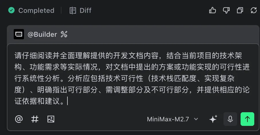 针对项目重构类需求,按传统开发模式,我们需要大量时间阅读源代码梳理逻辑,期间因历史原因代码无注释,需结合上下文推理调试。了解原有逻辑后,还需结合新项目架构制定实施步骤,并设计单元测试确保既有逻辑稳定运行。整个流程(研发、测试到发布)保守估计需要 3 个工作日。抱着试试看的心态,笔者将源代码阅读和技术文档整理工作交给 M2.7 负责。