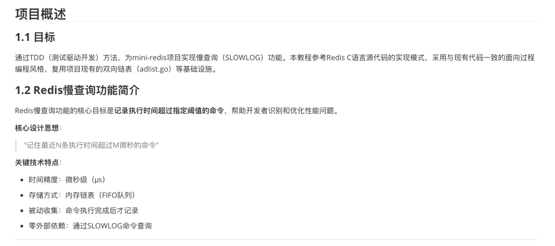等待片刻后 M2.7 完成文档最后的可行性分析和整理,我们开始对其设计方案进行进一步的复核确认,从项目概述上可以看到 M2.7 很好地针对 mini-redis 项目结构进行分析,很准确地定位到慢查询可以直接复用的链表结构体并完成文档微调: