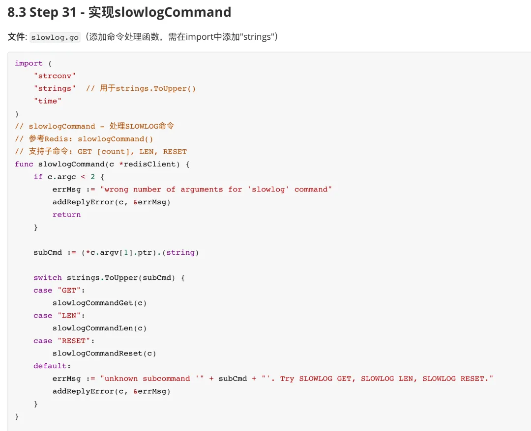 经过仔细复核设计文档,整体开发思路基本一致,但在代码组织细节上仍有调优空间——例如 M2.7 将slowlog指令独立成文件,而未遵循项目惯例统一放入command.go。考虑到慢查询功能并非核心内存读写指令,且其日志管理逻辑相对独立,这一处理也算合理折中。权衡之后,我们决定保留 M2.7 的实现方式,同时手动调整部分文件布局以符合既有工程规范,随后推进剩余开发工作。