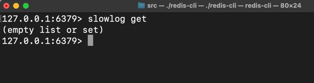 启动 mini-redis 服务端后,键入 slowlog get 默认返回空: