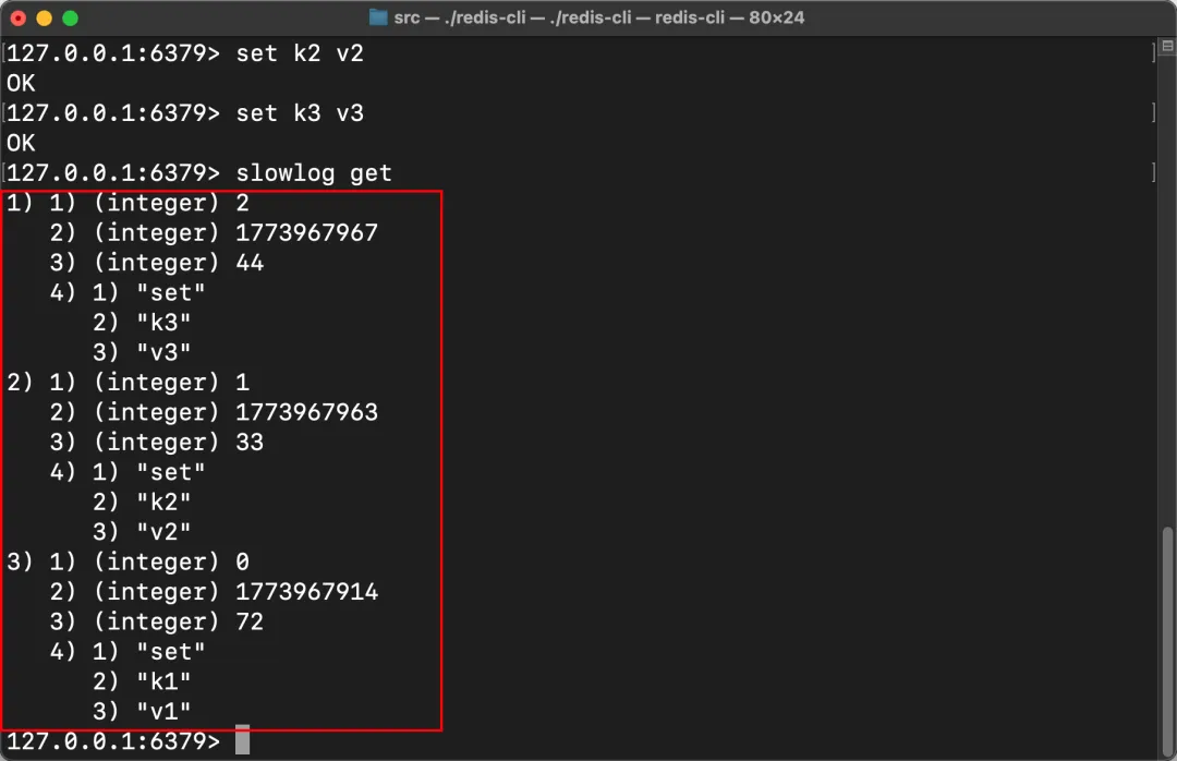 执行简单的 set 操作后,键入 slowlog get,这条指令如预期被判定为慢查询指令并输出: