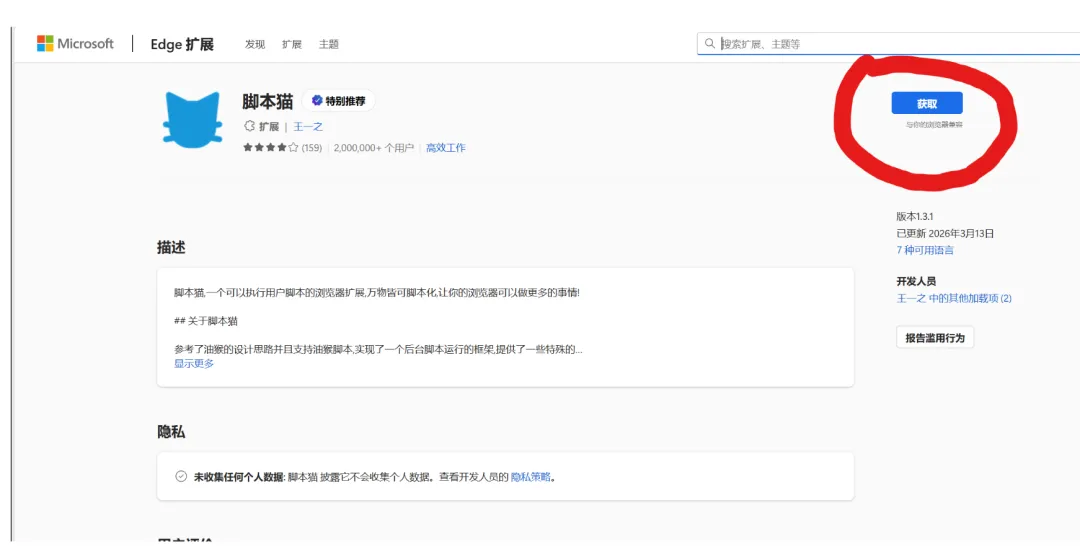 先来打开电脑自带的edge浏览器,找一下右上角的“插件”,点“获取插件”,搜索插件:“脚本猫”,点击“获取”