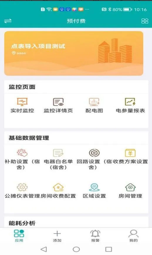 程序首页显示了监控页面、能耗分析、电能质量、用户管理、需量分析、房间收费配置、报警管理、区域设置、运维管理、用户报告、财务分析、基础数据管理、日志管理等十三大功能。