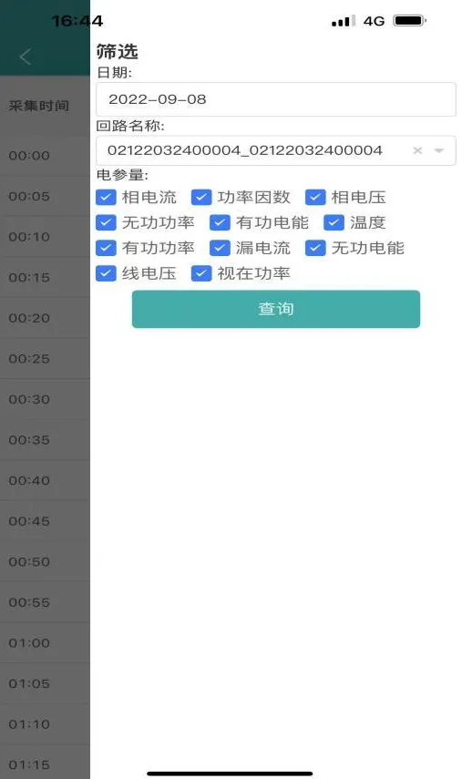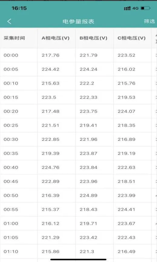 电参量报表页面展示了项目设备的电参量报表,用户可以查看各个区域设备的电参量报表,可以通过日期、能源节点、电参量种类筛选查看对应实时数据,