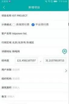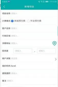点击右上角加号按钮,添加项目信息,输入项目名称、客户名称、行政区域、详细地址、经纬度、选择用户关联、组织机构。点击保存即可创建项目,编辑操作方法与新增一致,如图